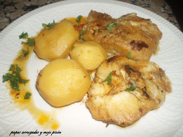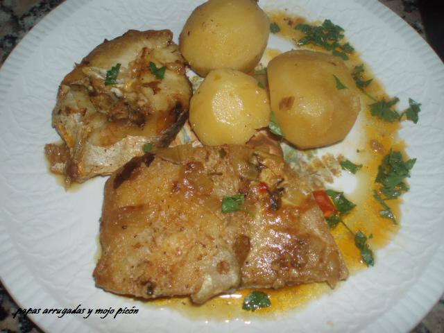 Preparación:Se pelan las papas y se ponen en un caldero a fuego con agua que las cubra.Después se va dorando el pescado un poquito y se va poniendo en un plato aparte.