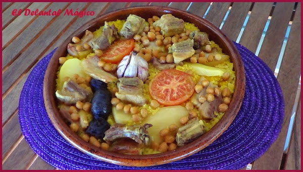 Colocar en una olla el tomate picado, el arroz, el caldo guardado de los garbanzos y sazonar al gusto. Agregar los garbanzos y dejar que hierva. Cuando llegue al punto de ebullición, retirar del fuego y agregar el contenido de la sartén. Llevar al horno durante unos 20 minutos aproximadamente.