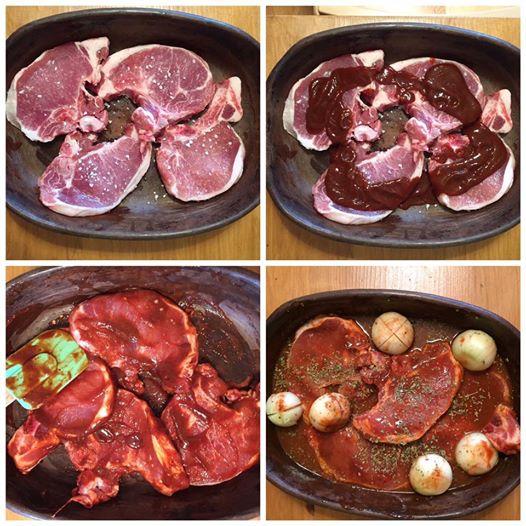 Coloca las chuletas o la pulpa en una fuente que resista el horno junto con las cebollitas peladas y cortadas parcialmente en cuatro.