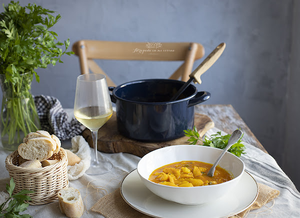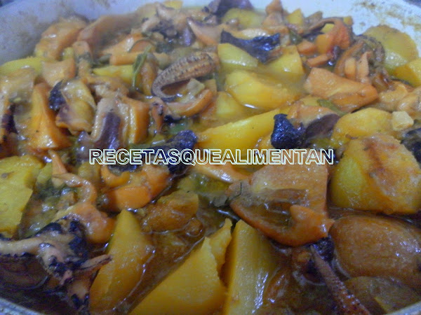 Pelar y cortar las patatas a trozos e incorporar a los chocos, cocer 20 minutos o hasta que las patatas estén tiernas.