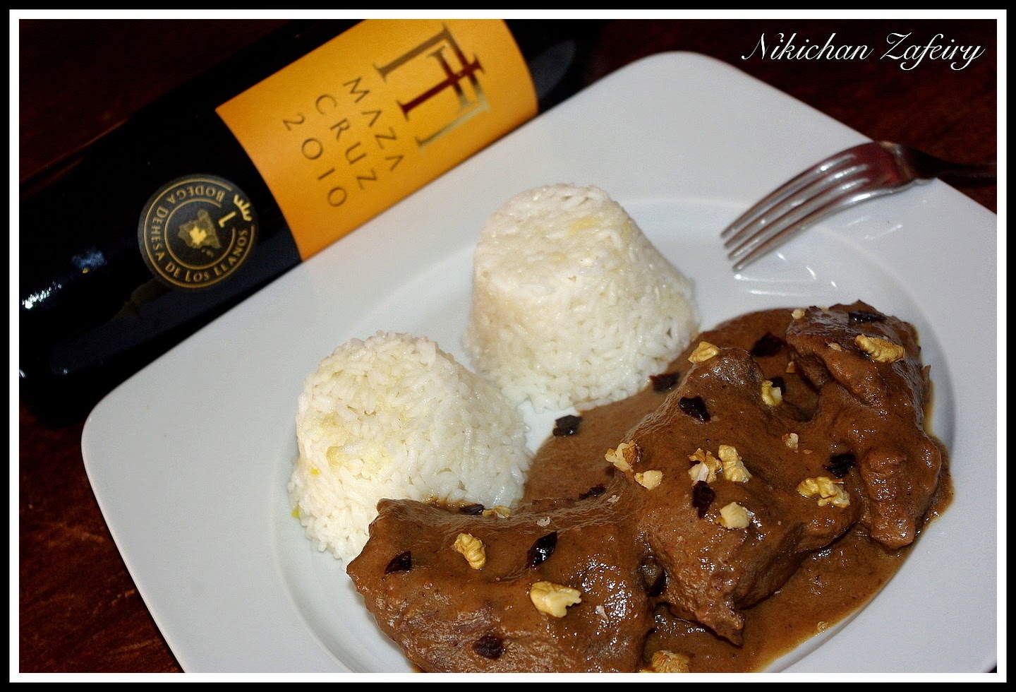 hacemos las chuletas dejamos aparte ,en el mismo aceite hacemos las ciruelas en trozos ,las nueces el pimiento muy picadito, dejamos que se haga un poco todo junto cuando esté añadimos el vaso de vino dejamos que reduzca un poquito! pasando a emplatar como en la imagen.