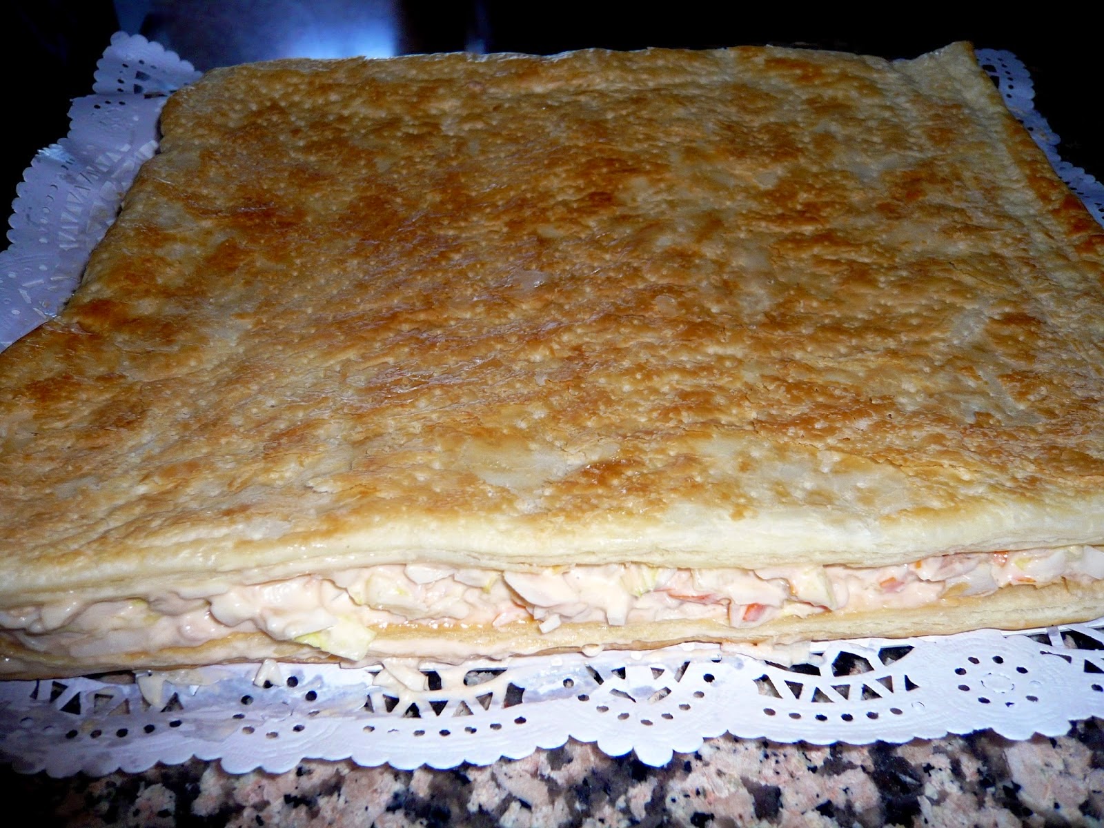 "Para conseguir la textura final se prepara una masa de harina, agua y sal (amasijo) y se extiende. Sobre ella se extiende la grasa que se emplee (empaste) y se dobla sobre sí misma varias veces. La repetición de dicha operación hace que vayan quedando finas láminas impermeabilizadas por la grasa empleada. Estas retienen el vapor que se genera con el agua de la masa durante la cocción y dichas láminas se separan como las hojas de un libro." Por lo que espero que con esta aclaración les facilite realizar las recetas saladas con hojaldre