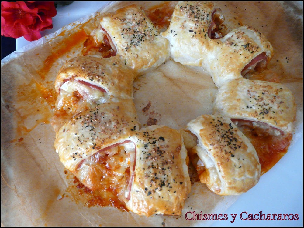 Chismes y cacharros nos ha preparado una rosa de hojaldre con jamón york, camembert y chistorra. La combinación de sabores nos parece fantástica.