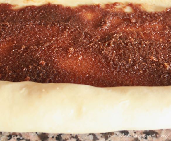 Tomamos la masa y le damos forma de rectángulo, extendemos la preparación anterior sobre la masa y enrollamos teniendo cuidado de que quede bien prieto y