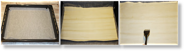 Extiende sobre la bandeja del horno la placa de hojaldre, y pincha con un tenedor todo el hojaldre, esto evitará que suba la masa.