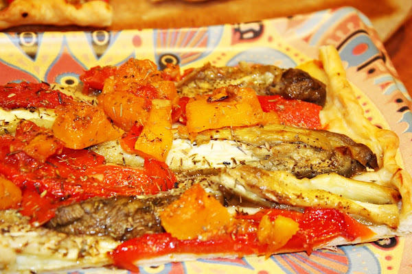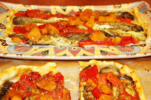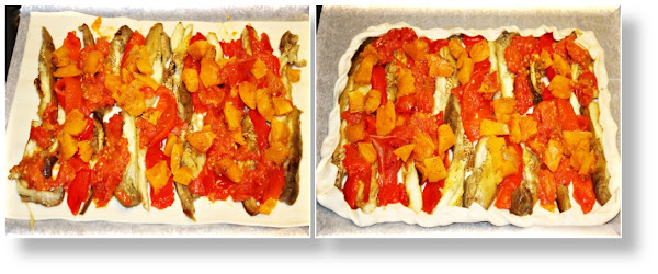 Extiende sobre la masa de hojaldre las verduras y calabaza que tenías reservadas. A poder ser en tiras o trozos pequeños.