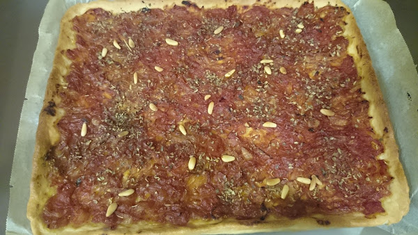 4-Extender la verdura sobre la masa, espolvorear el pimentón dulce y hornear a 170º durante unos 40 minutos aproximadamente, hasta que los bordes están dorados (precalentar antes el horno).