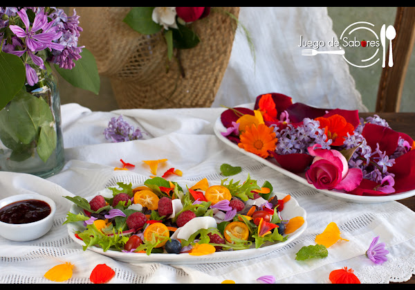 Ingredientes: lechuga, pimiento verde, cebolla, pasas, sésamo, pipas, flores variadas, aceite de oliva, vinagre.