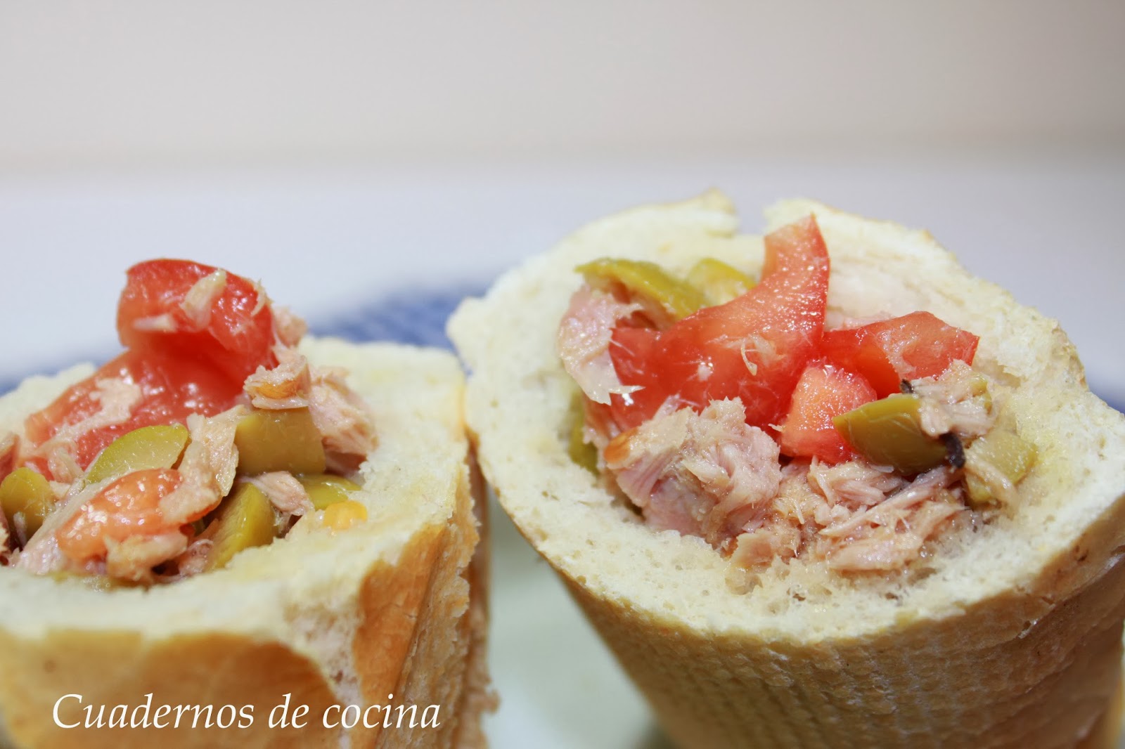 ¡Qué original es este falso sushi para pequeños paladares! Como podéis ver en la imagen, necesitaremos pan, tipo baguette) cortada y vaciada de la miga, y los ingredientes con que queramos rellenar el falso sushi. En este caso, atún, tomate, huevo cocido y aceitunas. Un plato muy socorrido y con una presentación estupenda. Los más pequeños quedarán encantados. Fuente: Cuadernos de Cocina.