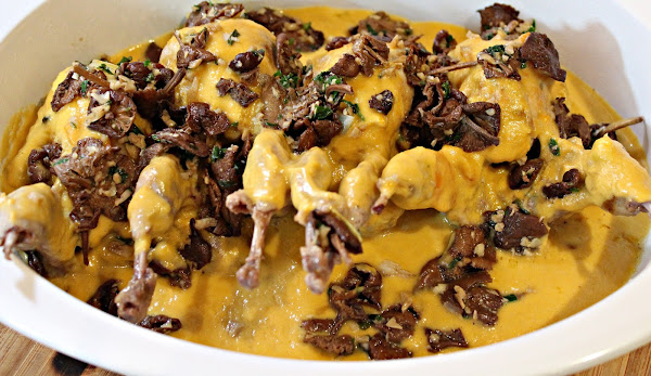 Coloca sobre una fuente las codornices. Tritura el caldo sobrante que quedó en la olla.