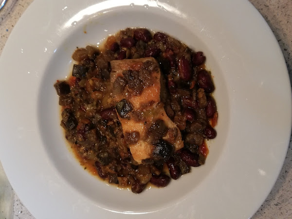 Lomo de Salmón con Chili de Verduras y Alubias Rojas