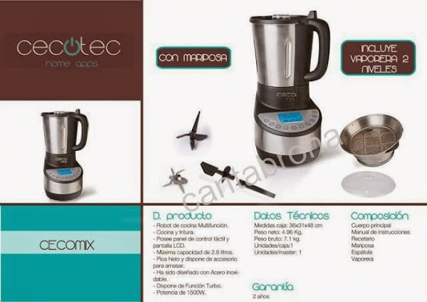 ![]() | My Cook Legend- Taurus-Inducción Sin conectividad. Funciones: moler, pulverizar, rallar, picar, triturar, trocear, emulsionar, montar, amasar, sofreír, cocción pasta, cocción al vapor, caldos, pesar y turbo. Con balanza, cesta vapor interna y externa, vaporera inox, vaso dosificador, paleta mezcladora, espátula, cestillo inoxidable y recetario. Potencia: 600 W. Capacidad 3 I. App |