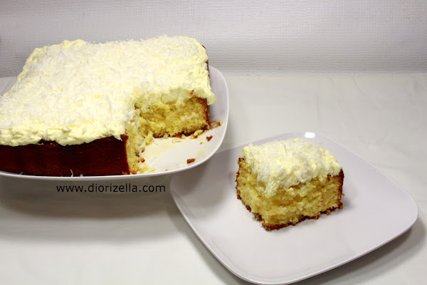Así luce el delicioso bizcocho de coco. Es un bizcocho esponjoso, ligero y húmedo. La crema batida le da un toque refrescante. Recuerda guardarlo en nevera para que la crema batida no se baje ni tampoco se eche a perder.