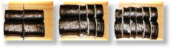PARA 12 MAKIS GRANDES: Puedes poner 1/2 alga marina nori cortada horizontalmente y conseguirás más rollitos.