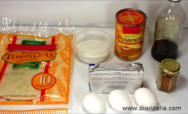 Los ingredientes que vas a necesitar son: plantillas de harina, azúcar, puré de calabaza, huevos, queso crema, especias para pie de calabaza y extracto de vainilla.