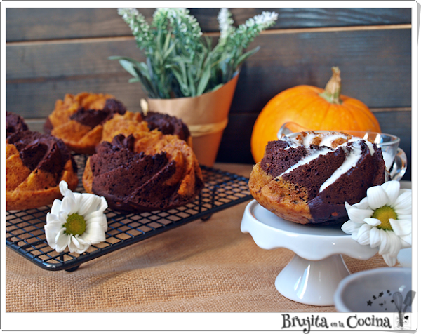 Mezcla el queso crema que debe estar a temperatura ambiente con el azúcar usando un batidor de mano. Agrega el puré de calabaza y mezcla bien. Luego agrega los huevos uno a uno. Finalmente añade las especias para pie de calabaza y el extracto de vainilla. Llena cada molde con la mezcla.