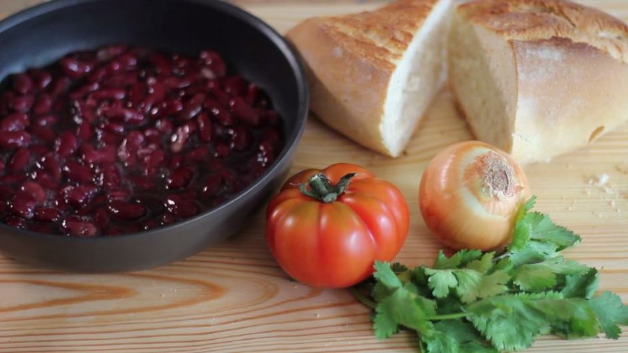 Lo primero que hay que preparar es la crema o paté de frijoles o alubias rojas. Podemos prepararla rápidamente con legumbres previamente cocidas. Ponemos los frijoles o alubias en una sartén al fuego y los vamos aplastando poco a poco con una cuchara de madera hasta conseguir el espesor deseado. Una vez elaborado, lo extendemos sobre unas rebanadas de pan (o bolillo, como le llaman en México).