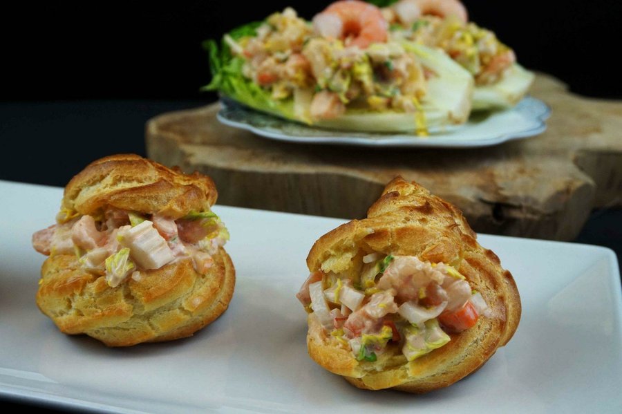 Aunque tal vez prefiraís más un relleno salado, ya que esta maasa de profiteroles es neutra, y hacer por ejemplo, unos deliciosos profiteroles salados rellenos de cocktail de gambas o langostinos. En esta ocasión el relleno es muy personal, en este caso lo hice con salsa rosa, langostinos cocidos, palitos de cangrejo, cogollo de lechuga, piña, y un poco del jugo de la piña.