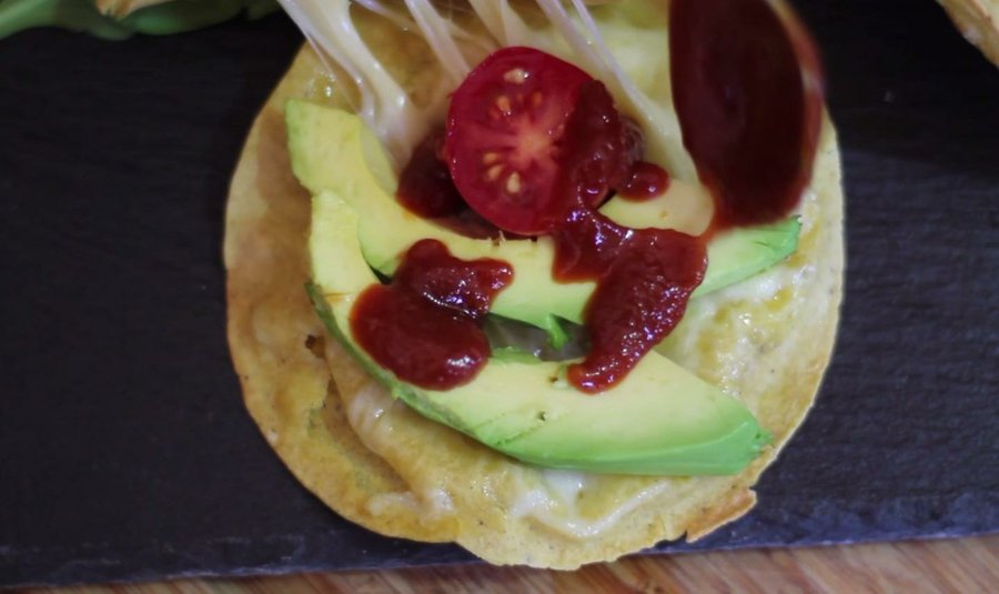 Te dejamos un vídeo con la demostración de su elaboración. En este caso, unas quesadillas se rellenan con aguacate y salsa chipotle y otras con aguacate, tomates cherry y la misma salsa.