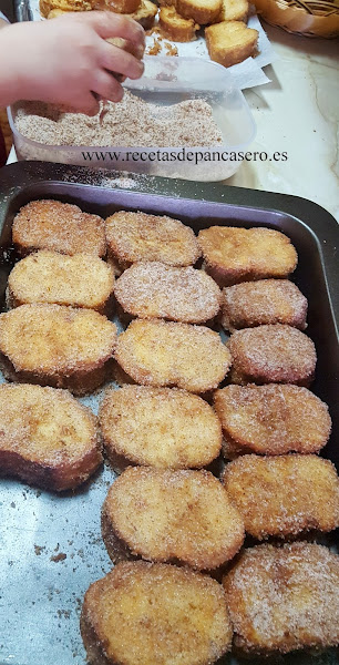 Una vez que tengamos todas fritas les quitamos los restos de huevo frito que se quedan en forma de hilillos y las pasamos por la mezcla de azúcar y canela, las ponemos en una bandeja de presentación y ya las tenemos listas para disfrutarlas.