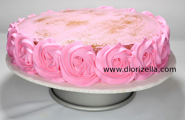 Paso 9: Decore el bizcocho con la técnica rosette. Para esta técnica se usa la boquilla 1M y se comienza aplicando una pequeña cantidad de frosting en el centro y se da la vuelta alrededor. Repita hasta cubrir los lados del bizcocho. Esta técnica se ve muy bonita, elegante y a mi me encanta.