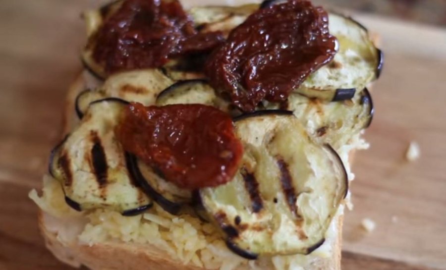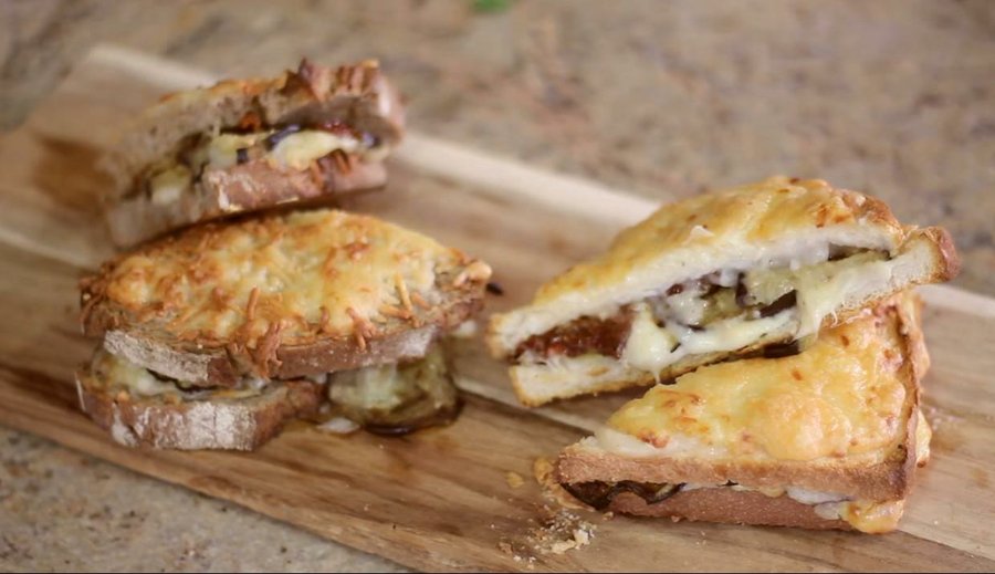 En este sándwich Croque Monsieur vegetal mantenemos el pan del molde, el queso rallado y la bechamel, pero sustituimos el jamón cocido por berenjena cocinada a la plancha y tomates secos en aceite de oliva. ¿Te imaginas lo bueno que tiene que estar?