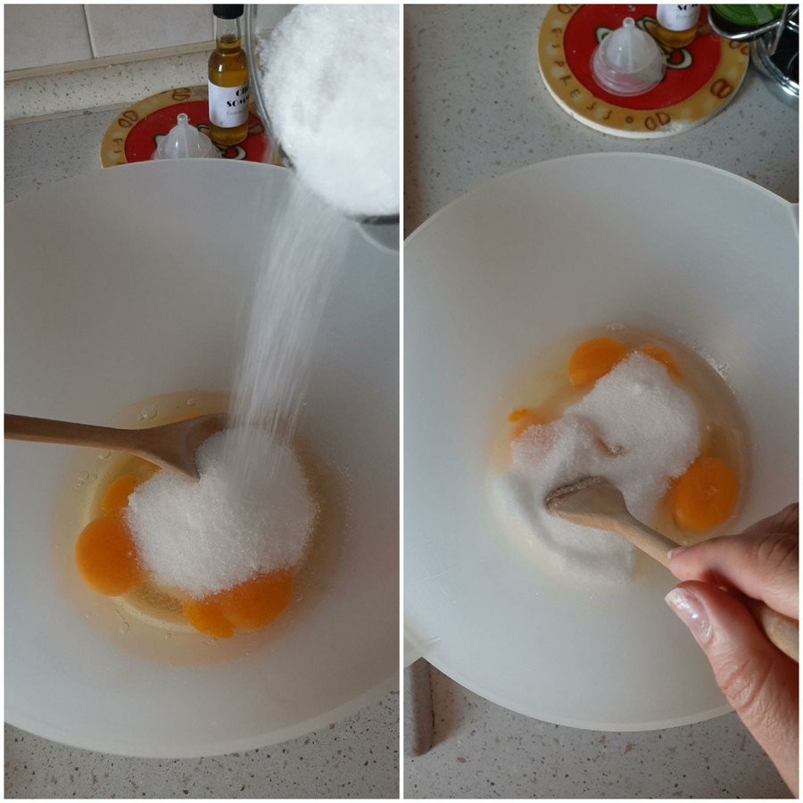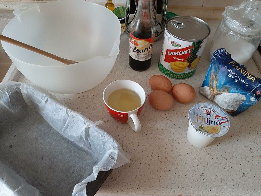 Tres huevos, una taza de azúcar, una taza de aceite vegetal, tres tazas de harina leudante, un sobre de polvo de hornear, un yogurt de piña ( sino lo tienen puedes usar uno de limón o uno blanco natural), una cucharadita de vainilla y una lata de piña en rodajas. Esta vez usé la piña en lata porque es más rápido pero generalmente prefiero usar la piña natural; y tres cucharadas de azúcar para hacer un caramelo.2. Preparación: