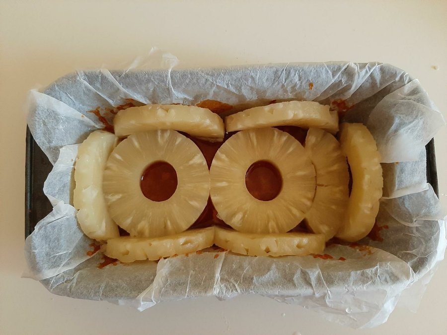Hasta aquí, ven que es sumamente fácil??? ..Ahora bien, es el momento de agregar el caramelo al molde, yo en esta oportunidad elegí un moldo tipo ponque, quería probar desde hace tiempo hacer la torta con esta forma porque es muy cómodo para tenerlo en la mesa para los desayunos y meriendas, pero esto también es vuestro gusto puede ser redonda o cuadrada. Les quería decir, el molde lo forrè con papel encerado, siempre lo uso para los moldes ya que es mas fácil al momento de desmoldar la torta. De esta manera viene con menos imperfecciones y a la hora de lavar el molde se vuelve más fácil. Una vez vaciado el caramelo disponemos las ruedas de piña en el fondo del molde y finalmente vertimos la mezcla de la torta. la metemos en el horno ventilado a 180º por 40 minutos, de todos modos deben insertar un cuchillo fino o un palillo y se deben asegurar de que salga limpio, lo que indica que la torta esta lista. Pasado el tiempo de cocción sacamos la torta, esperamos que se refresque un poco y la desmoldamos y voilaaaa!!! nuestra torta de piña está lista!