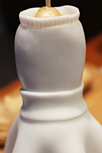 Con un rodillo, extiende un poco de pasta de azúcar color blanco y envuelve el tórax menos el cuello -esto será la parte de arriba del vestido-.