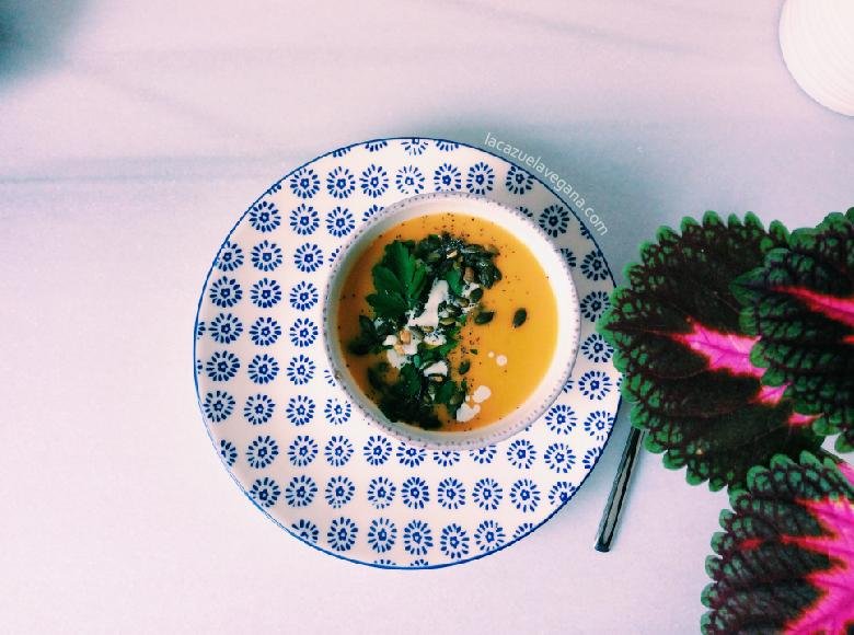 De primero, crema de calabaza y zanahoria de La Cazuela Vegana. De segundo, tostada con queso crema y salmón ahumado.JUEVES