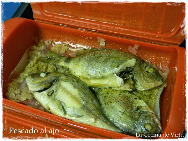 Estos pescados son pequeños, nosotros les decimos mojarritas, y son la captura de mi peque que se nos ha aficionado a la pesca... y esta feo que yo lo diga no se le da nada mal..Para hacerlos utilizo el estuche de vapor Lekue.Es una receta muy muy fácil y rápida de preparar...Ingredientes3 piezas de pescado no muy grandescebolla troceadaaceitesalvino blancoajo seco picado (especia)hacemos una base ...