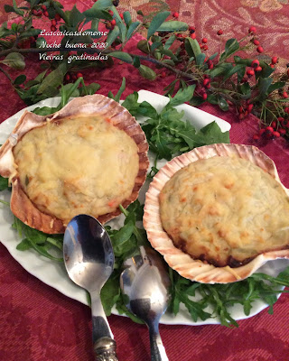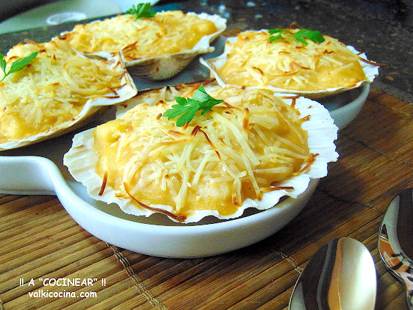 Conchas de vieira,aceitrre,harina,leche,nata líquida,2 colas de rape congeladas,gambas,hojaldreBien como veis es muy fácil, se trata de hacer una bechamel un poco densa, como si fuese para croquetas para poder rellenar la concha de vieira. Cada una que haga la bechamel como tenga costumbre. Yo personalmente suelo combinar mantequilla y aceite de oliva, luego echo la harina y la dejo que se cocine un ratito sin parar de remover, y la voy mojando 1º con un poco de caldo de pescado para que tenga más sabor, luego le echo un poco de nata líquida para que quede mas cremosa y luego le voy cogiendo el punto que quiero con la leche. Luego, añadirle a la bechamel los ingredientes que hallais elegido (merluza, gambas, chatcka, rape...), no se, habrá quien haga la bechamel con cebolla, otros que no, otros q le echen nuez moscada, otros no….eso a gustos de cada uno¡