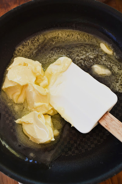 Calentamos la mantequilla en la sartén a fuego medio. Derretimos la mantequilla por completo y retiramos la sartén del fuego. Añade el azúcar y el huevo. Remueve todo muy bien hasta conseguir una mezcla homogénea. Tamizamos la harina junto con la levadura y la añadimos a la mezcla. Removemos muy bien. Agregamos el chocolate (no lo añadas todo, para poder decorar un poco por encima). Remueve todo muy bien hasta integrar el chocolate. Agrega la masa a la sartén y extiende la masa por toda la sartén con la ayuda de una espátula. Agrega los trozos de chocolate que nos reservamos anteriormente por encima.
