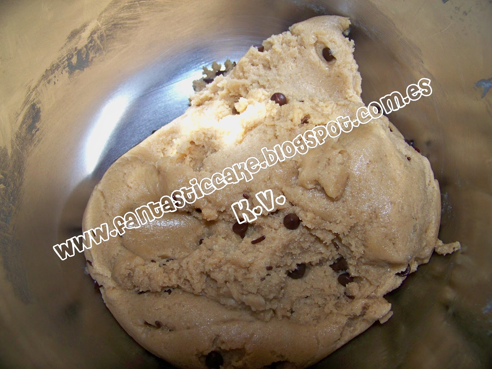 6.- Cuando esté lista, sacamos el bol de la batidora. Reservamos algunos chips de chocolate y añadiremos el resto a la masa y uniremos con una espátula a la masa. Las mezclamos hasta que queden bien incorporadas a la masa.