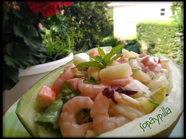 Lechuga,Tacos de Melón,Gambas,Txaka (Surimi),Mahonesa,Ketchup,Zumo de NaranjaEn el fondo de la copa poneMOS la lechuga picada. Encima, los tacos de melón dulce, y sobre el melón ponemos las gambas cortadas y las tiras de surimi.