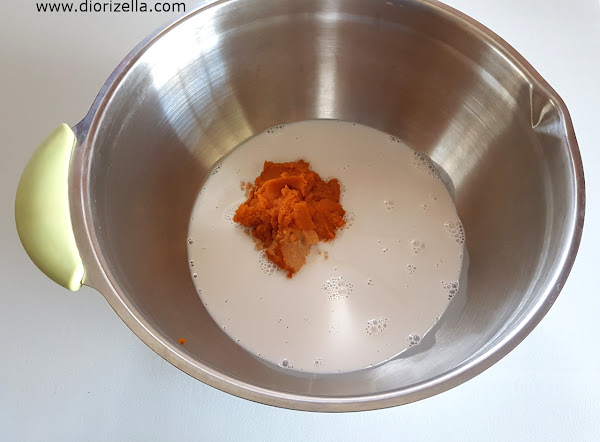 1. Mezclar el puré de calabaza y la leche de coco en un recipiente grande con la ayuda de un batidor de mano o en la licuadora.