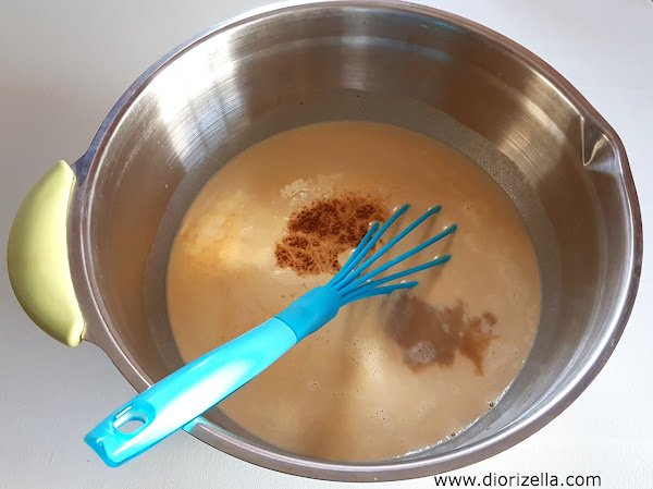 3. Incorpora el resto de los ingredientes. Primero, la leche evaporada, el caldo de especias, el ron, el extracto de vainilla y el "pumpkin spice". Nuevamente mezcla bien con el batidor de mano.