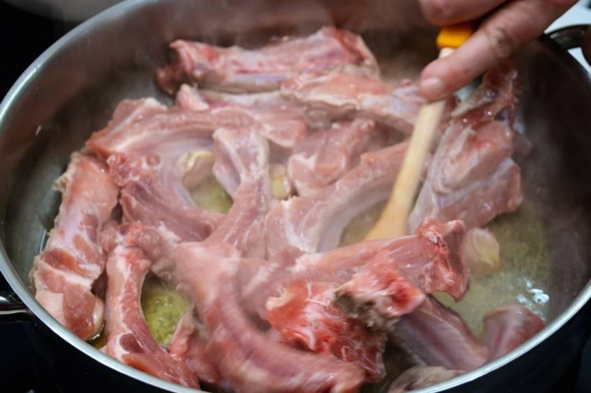 Cuando veáis que los ajos comienzan a chisporrotear, añadís los trozos de costilla previamente sazonada y comenzáis a rehogarlos para que sellen.