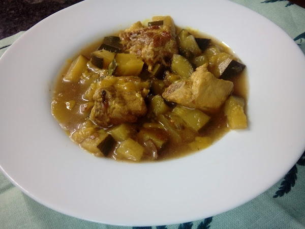 Un guisado con el calabacín como protagonista. Al no llevar patata lo podemos congelar.-2 calabacines grandes-400 g. de costillas de cerdo en trozos pequeños-una cabeza de ajos pequeña-aceite de oliva-sal-caldo de carne-tomillo, cúrcuma,pimentón dulceComenzamos sofriendo las costillas en una cazuela amplia. Troceamos los calabacines en cuadrados medianos y agregamos a las costillas. Cortamos la ca ...