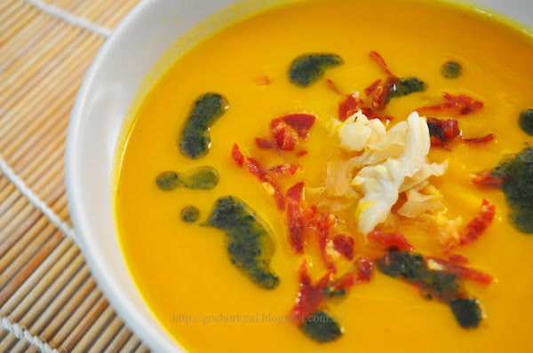 Confieso, si es que no lo he hecho ya, mi pasión por las cremas en cualquiera de sus advocaciones, ya sean dulces o saladas, y sean cual sean sus ingredientes. Las posibilidades de variación que ofrece este plato con sólo mezclar productos, añadir especias, experimentar con la textura (más densa o más fluida, más suave o que se note el grano) acompañar con crujientes picadillos de verduras crudas o frutos secos... seducen a cualquier espíritu inquieto en la cocina. ¿Quién ha dicho que una crema es un plato soso y poco imaginativo? Así que sin más dilaciones ni excusas vamos con nuestra crema de hoy: calabaza y jamón son sus ingredientes principales a los que la suma del apio añade la nota picante que equilibra ambos sabores . El resultado de esta unión donde se combinan la suavidad del vegetal con la reciedumbre de la carne curada resulta no sólo apetitoso y grato al paladar sino saludable y nutritivo. La cocción al vapor nos permite aprovechar al máximo las virtudes de las verduras y el añadido de las pipas de calabaza le pone el toque festivoa esta riquísima crema.