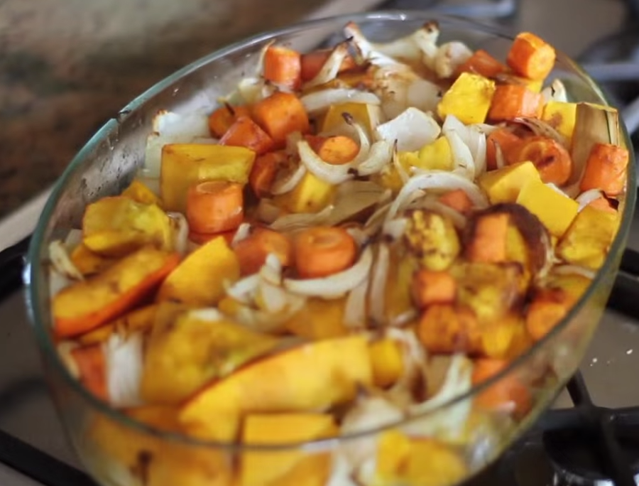 Para preparar nuestra crema de calabaza, partimos en pedazos una calabaza mediana y los ponemos en una fuente apta para horno. Añadimos también cebolla troceada, 4 zanahorias también cortadas, un poco de sal, especias indias al gusto (o las que se prefieran), y un chorreón de aceite de oliva. Removemos para que se impregnen todos los ingredientes del aceite y de las especias y horneamos 40 minutos a 180 ºC.