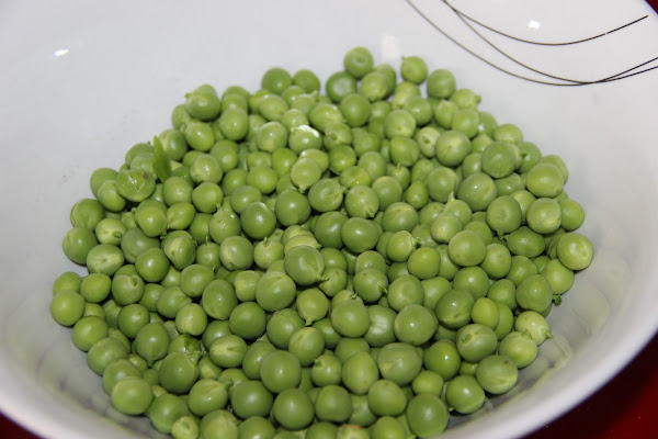 Antes de triturar toda la verdura podemos reservar algunos guisantes para adornar el plato final.