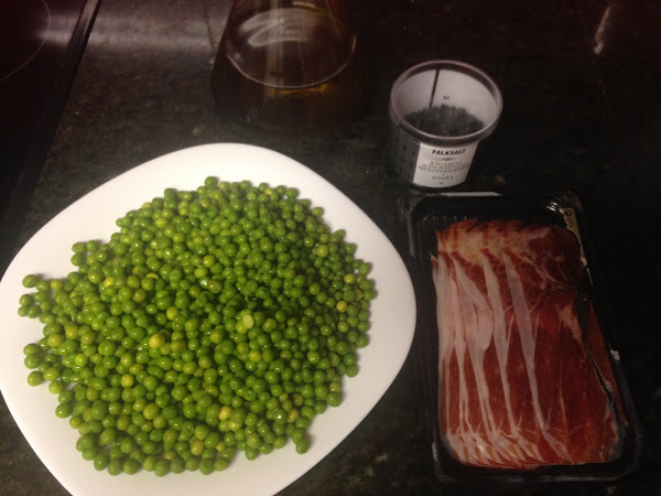 Ingredientes:(para 2 personas)300 gramos de guisantes100 gramos de jamón iberico de bellotaAceite de olivaEscamas de sal negraElaboración:Pondremos una cazuela al fuego con agua y sal, cuando empieze a hervir echaremos los guisantes.Los dejaremos cocer durante 15 minutos a fuego medio.Una vez cocido los colamos y los reservamos.En otra cazuela ponemos aceite de oliva.Cortamos a trozos el jamón y u ...