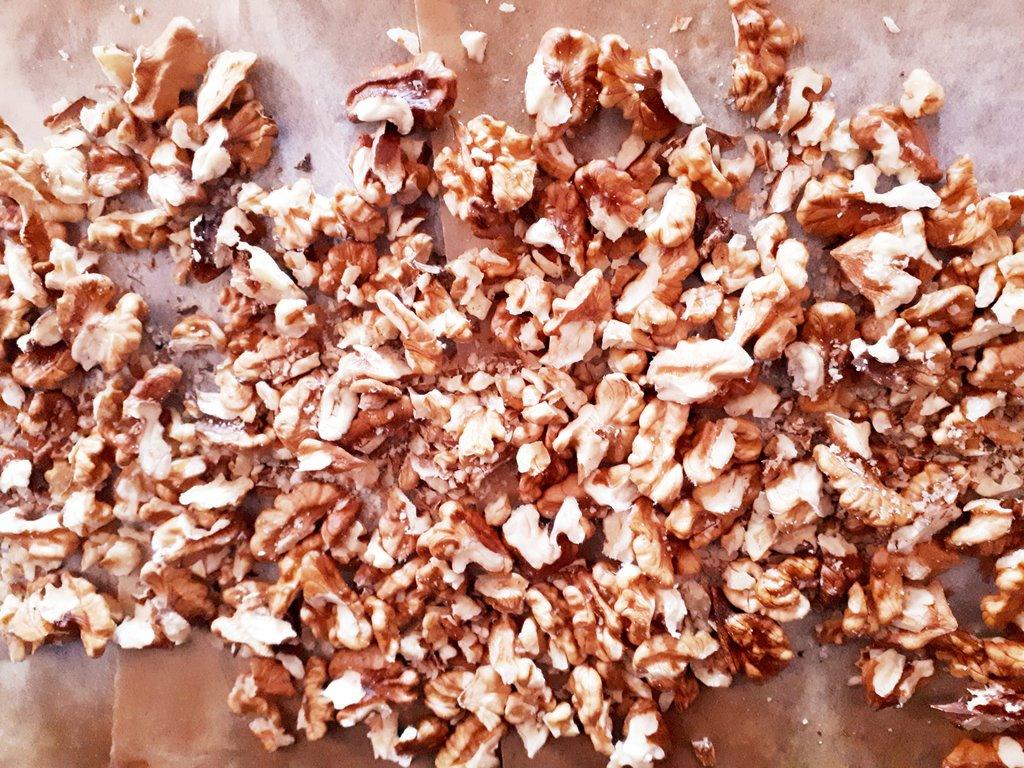 Comenzamos tostando las nueces en el horno. Para ello ponemos sobre la bandeja del horno un papel sulfurizado y encima las nueces peladas. Encendemos el horno a 180º y sin precalentar, introducimos las nueces. Las dejamos como unos 10 minutos o hasta que estén tostaditas pero cuidando que no se quemen. Otra alternativa es tostarlas en la sartén amplia, para ello ponemos todas las nueces que quepan en una capa (sin amontonarlas) y las tostamos a fuego medio bajo removiéndolas de vez en cuando.