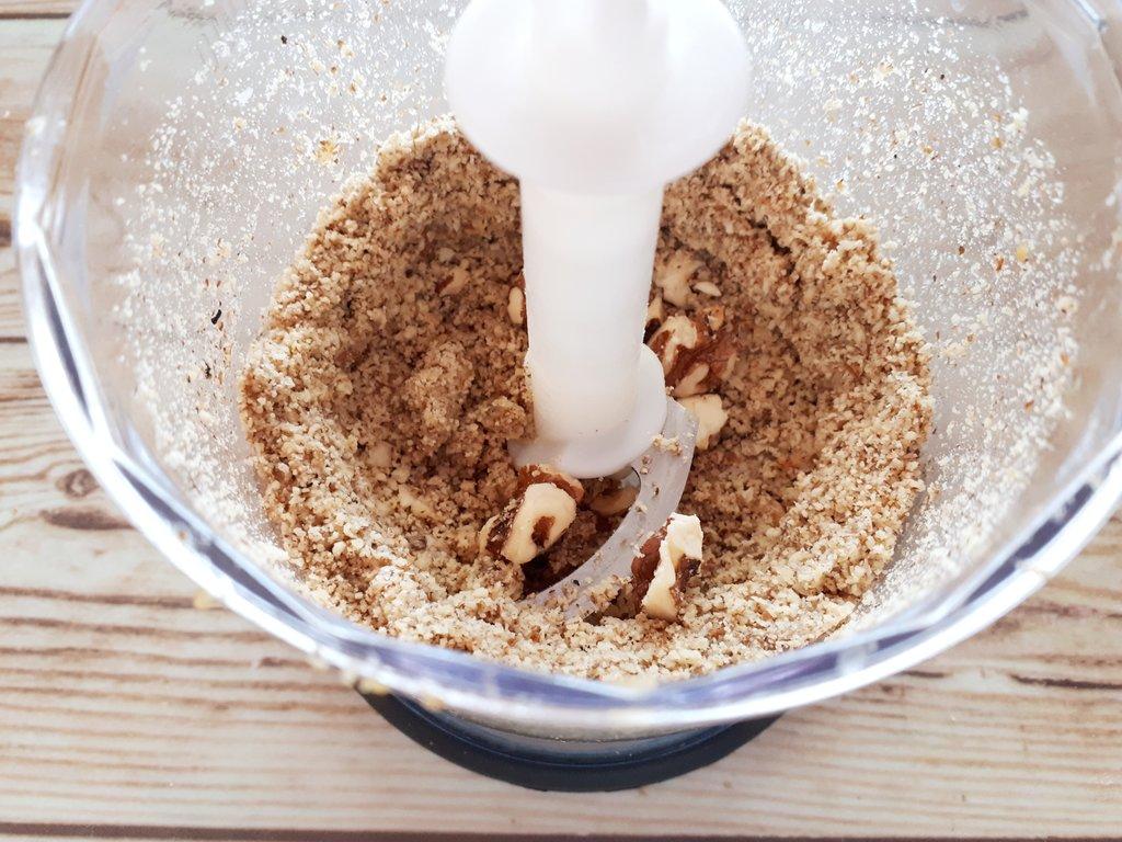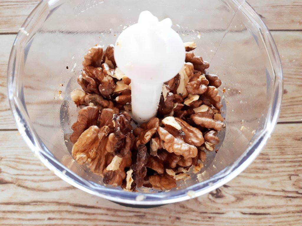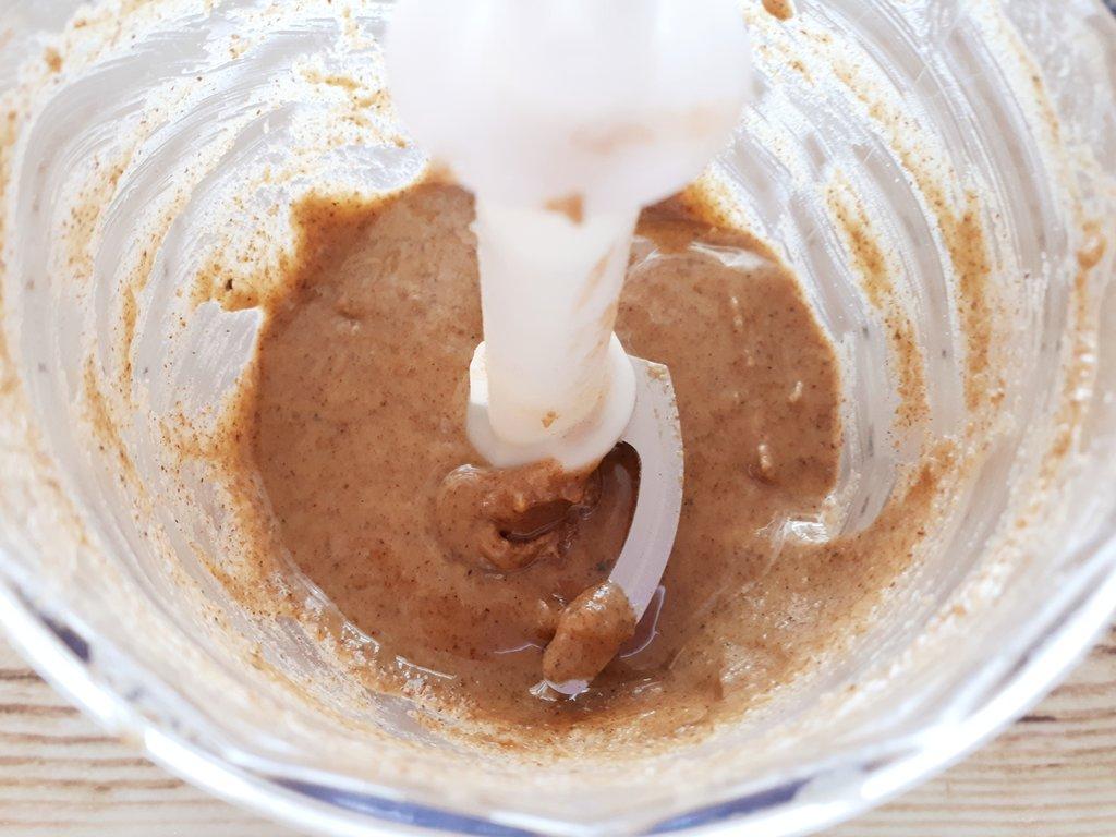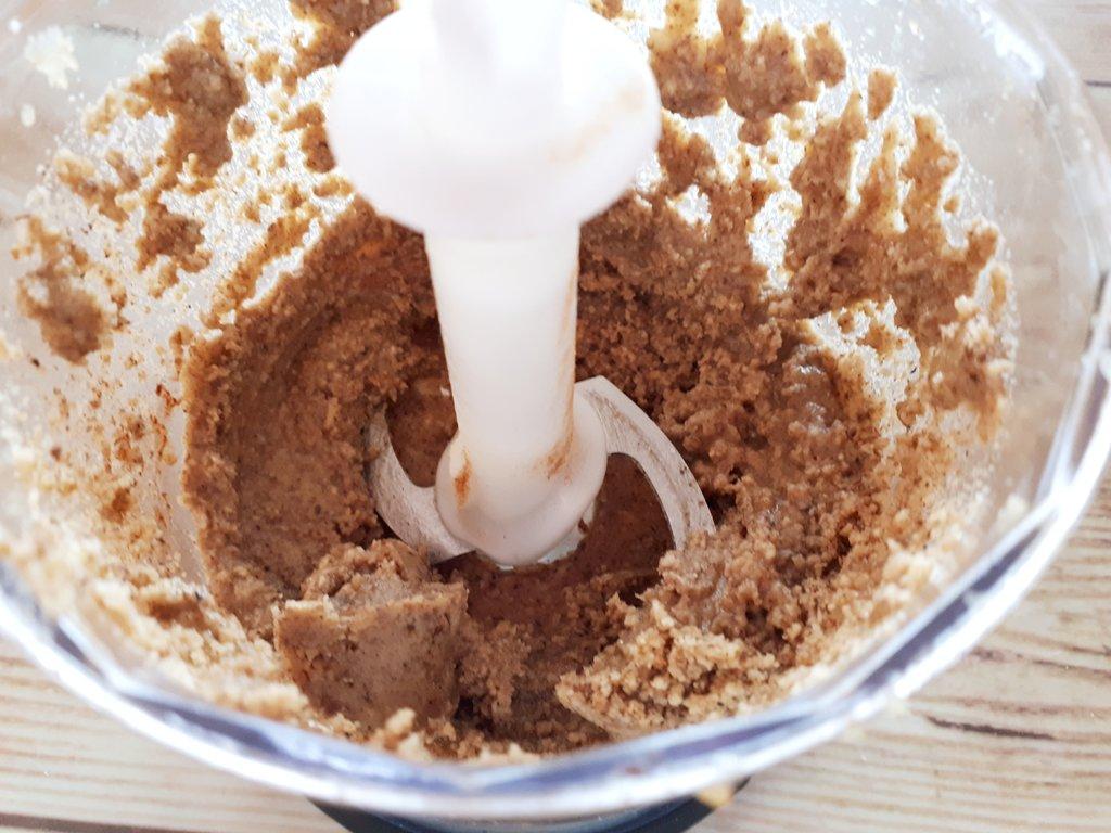 Introducimos las nueces en la batidora junto con la pizca de canela y de sal y las picamos a máxima potencia unos minutos. Abrimos la batidora, bajamos la mezcla de las paredes y seguimos triturando a media potencia hasta obtener una pasta cremosa (la trituración prolongada ha hecho que las nueces expulsen su aceite). Debemos parar de vez en cuando para bajar la pasta de las paredes de la batidora y así también evitar que se caliente el motor.