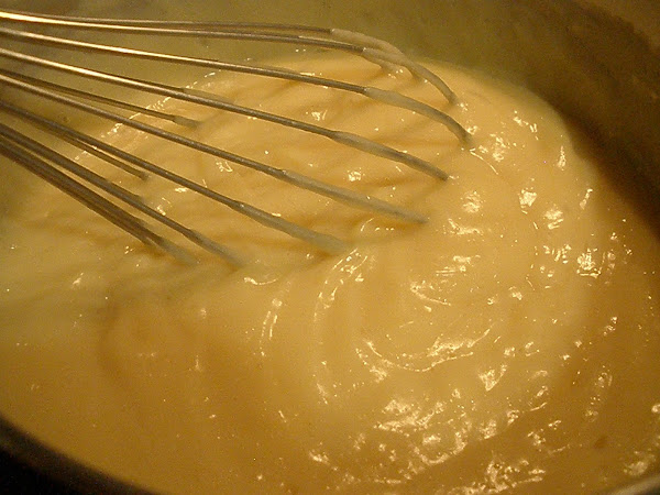 Una vez que hemos incorporado toda la leche, volvemos a poner la crema en el cazo y la calentamos. Cuando comience a hervir, cocinamos a fuego suave, sin dejar de remover, durante 2 minutos. Permitidme que insista en la importancia de no dejar de remover la crema mientras la mantenemos al fuego, ya que, si dejamos de hacerlo, se nos pegará al fondo del cazo.