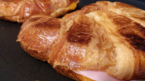 1. Abre el croissant, úntalo con mantequilla e introduce una loncha de queso Cheddar y una de Jamón York (yo las doblo por la mitad, dependiendo de la anchura del croissant).