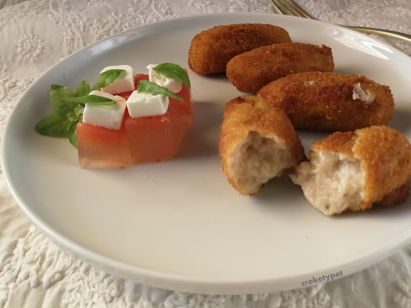 La masa la dejamos en una fuente tapada con papel film, la dejamos enfriar y a la nevera durante unas horas o hasta el día siguiente. La croquetas se hacen (Ver vídeo) y se pasan por huevo y pan rayado, Se pueden congelar o freír directamente y a comer. Buen provecho.