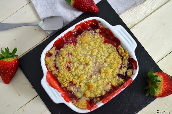 Precalentamos el horno a 180ºC. Cubrimos el fondo del molde con fresas o la fruta que se haya escogido. Ahora haremos el crumble. Es muy importante que la mantequilla esté fría, para lograr esta textura en forma de migas tan característica. Mezclamos los ingredientes con la mantequilla, hacedlo a mano hasta que consigáis una especie de migas. Colocamos encima de las fresas y horneamos unos 15 minutos.