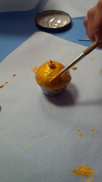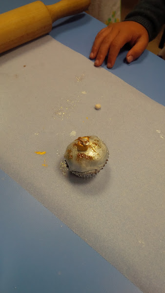 Como los Cup cakes pesaban mas por la parte de arriba, se volcaban. Para evitarlo se nos ocurrió rellenar los espacios que hay entre cada bolita con palomitas, como si fuera el corcho blanco que se pone en las cajas, para proteger las piezas delicadas.